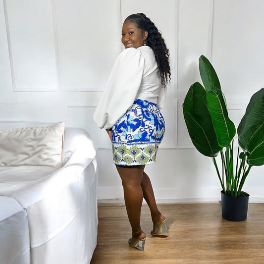 Mediterranean Muse Skirt– White & Blue Tile”