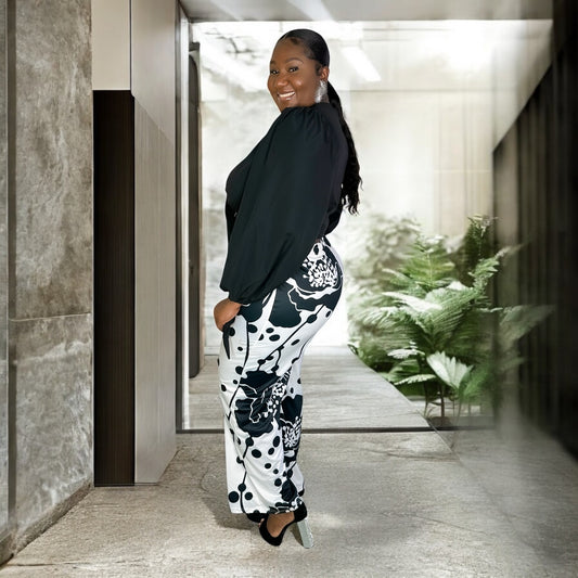 Floral Print Wide Leg Pants-Black & White