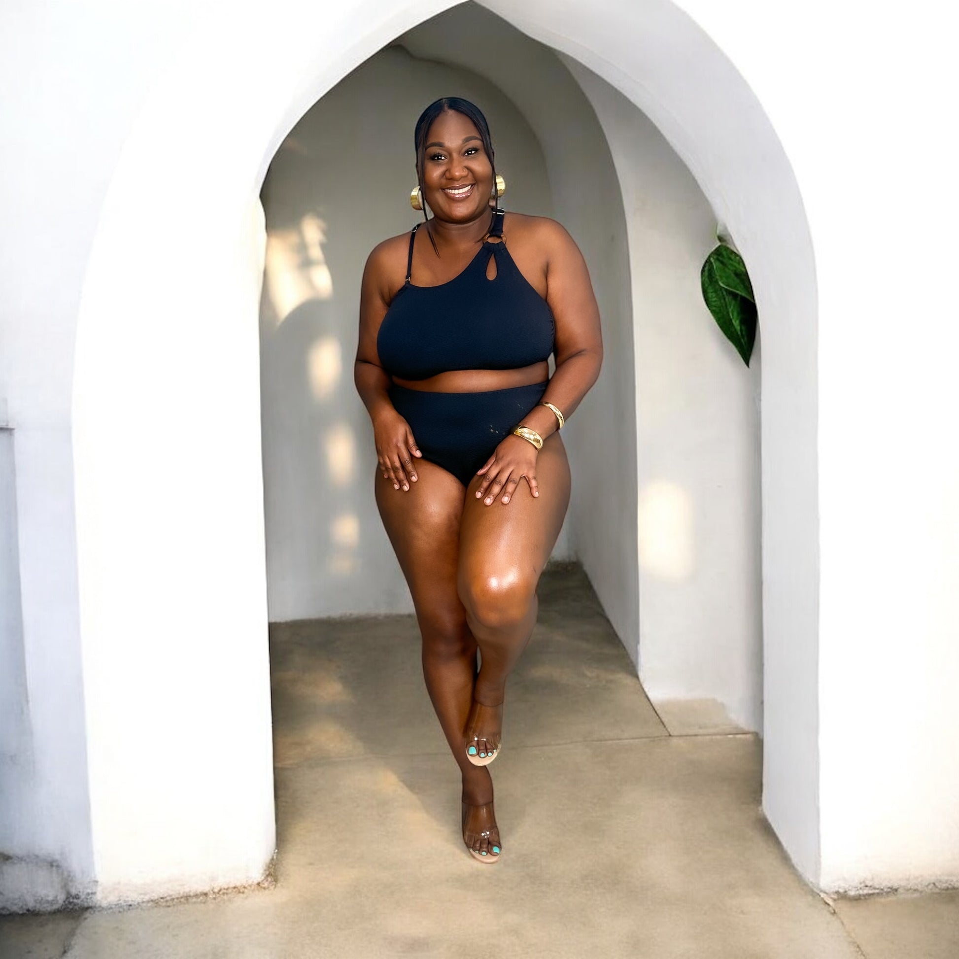 Turn every poolside moment into a statement with this sleek one-shoulder bikini. Designed with stretchy textured fabric, full bust support, and high-waist coverage, it hugs your body in all the right places.